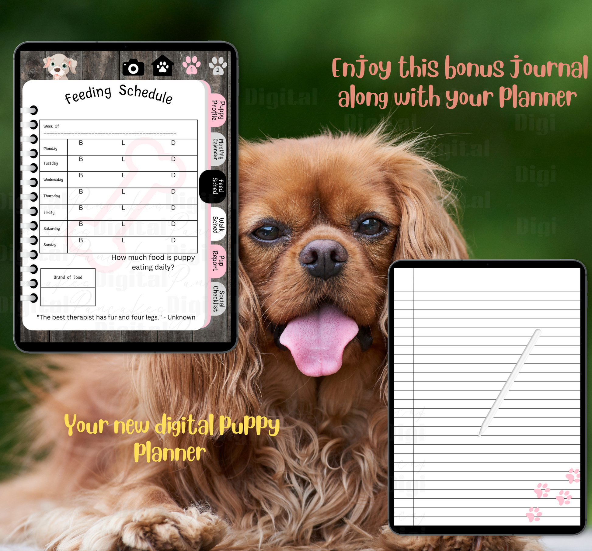 Raising a new puppy is an exciting journey, but it can also be overwhelming. That's where The Puppy Steps Companion Planner comes in! With new puppy owners in mind, we designed our planner to help you keep all the essentials of your puppy's care and training organized and in one place. From feeding schedules and vet appointments, to growth charts and more, you will enjoy its user-friendly layout and hyper-link tabs and pages for ease of navigation. You will stay on track and enjoy every moment of this journey raising a happy and healthy puppy. So don't wait - purchase and download The Puppy Steps Companion Digital Planner now and start your puppy-raising journey with confidence!