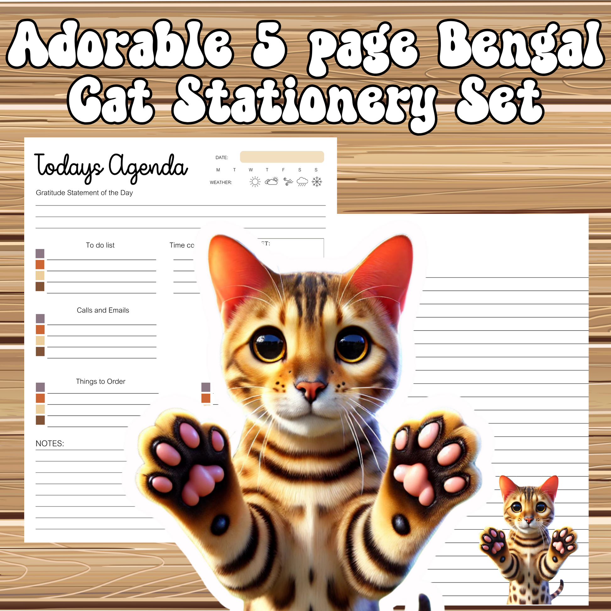 Super Cute Bengal Cat Themed | 5 Sheet Stationery Set | + 1 PNG Sticker | Daily Planner, Calendar, Lined Sheets & Notes | Instant Download