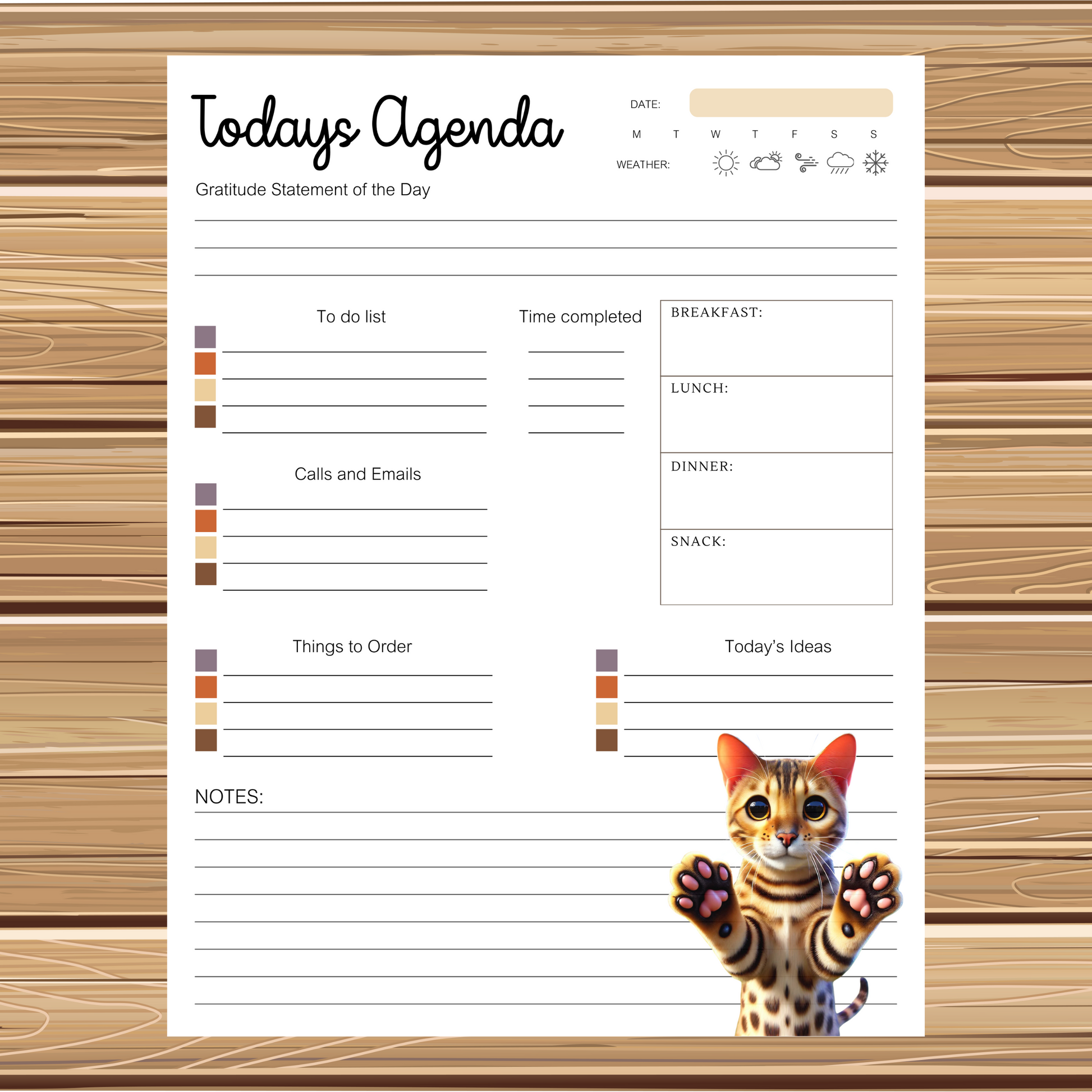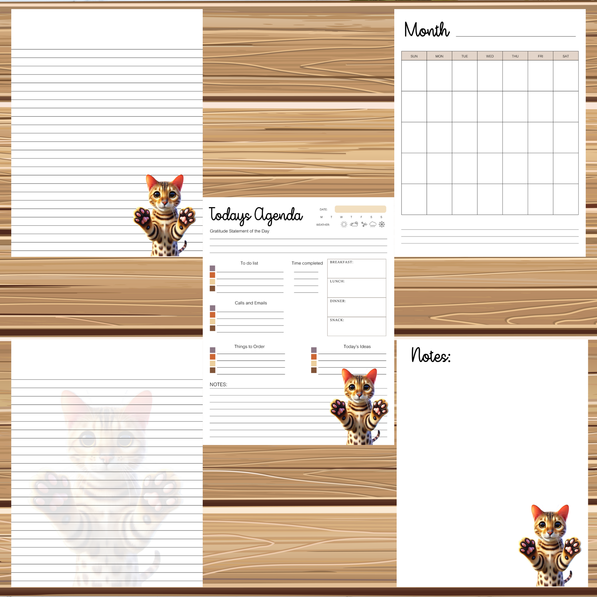 Super Cute Bengal Kitty Cat-Themed Digital Stationery Set | 5 Printable Pages + 1 PNG Sticker | Daily Planner, Calendar, Lined and Unlined Notes & Blank Sheet | Instant Download Size 8.5x11 | PDF Format for Easy Download